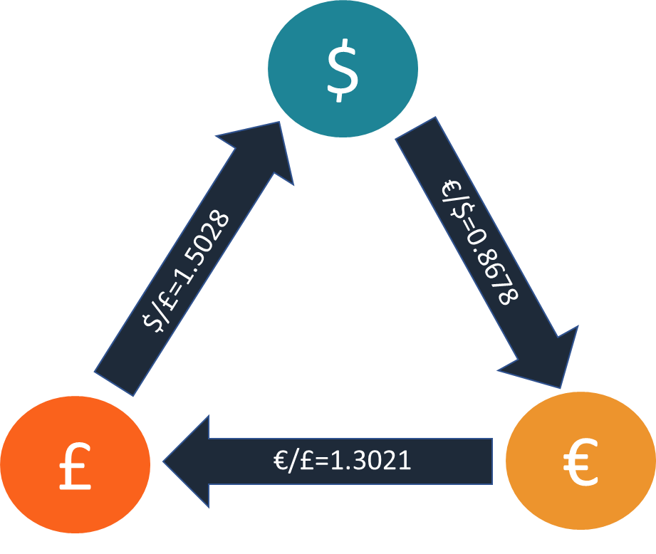 Arbitrase triangular melibatkan tiga mata uang yang berbeda dan mengeksploitasi perbedaan harga dalam kurs yang tidak sebanding antar pasar. Contohnya, seorang trader dapat membeli mata uang A dengan mata uang B, kemudian menukar mata uang B dengan mata uang C, dan akhirnya mengonversi mata uang C kembali ke mata uang A dengan keuntungan. -